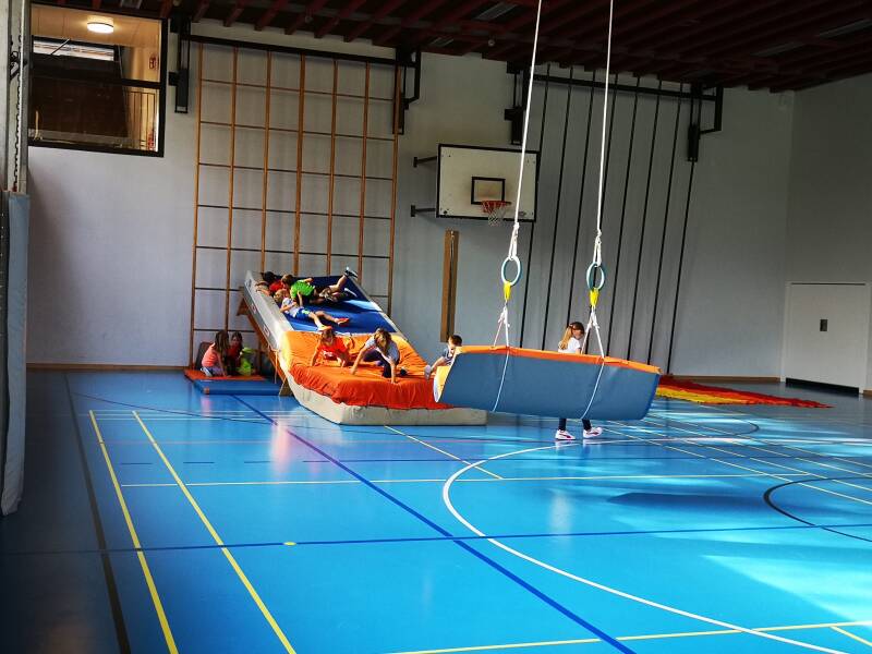 Dann liefen wir zu einer riesigen Turnhalle. Dort trafen wir dann auch Frau Widmer. In der Halle haben Frau Weber und Frau Furrer verschiedene Posten aufgebaut und wir durften dort spielen, klettern, hüpfen, rennen oder uns ausruhen. Wir schwitzen alle sehr.