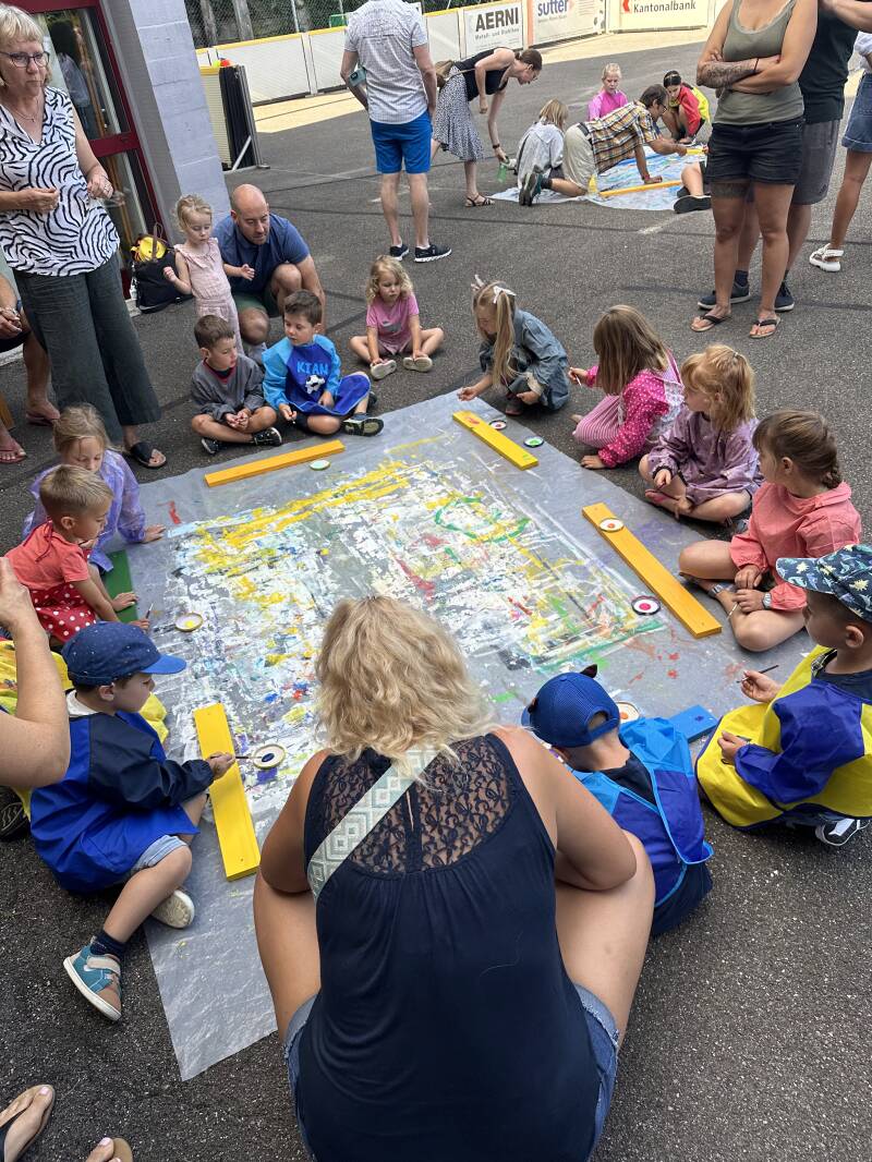 Nach dem ersten Ankommen im jeweiligen Klassenzimmer, ging es um 9 Uhr für den offiziellen Start auf den grossen Pausenplatz. Zahlreiche Eltern lauschten dem noch etwas verschlafenen Gesang der 56 Schulkinder. Die Sonne schien und liess - passend zur Rede von Charlotte Gaugler - alle Farben noch etwas kräftiger erstrahlen. Farbig, bunt und kreativ ging es auch weiter: jedes Kind durfte eine Holzlatte bemalen, welche schlussendlich den eintönigen Zaun des Pausenplatzes aufwerten.